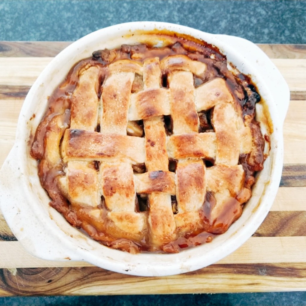 Mix all the ingredients together and add the water slowly till your dough is the right consistency. Let it chill while you make the filling. When ready, divide in two balls and roll it out. Pop one rolled out piece in your dish (pressing it in to fit evenly). Place the other piece of dough on top when your filling is ready (don’t forget to prick some breathing holes), or if you are feeling fancy cut it in strips and lattice it.