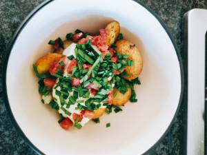 Cube and fry your bacon just how you like it (i like extra crispy). Slow roast the potatoes in the oven with the oil of your choice on 180 C. Season potato with salt and pepper or other complimentary spices. Once golden remove from the oven (don’t forget to check regularly to make sure the potatoes don’t burn or get stuck to the dish). Plate the potato, scoop on some sourcream, drizzle with bacon and sprinkle with chopped chives.